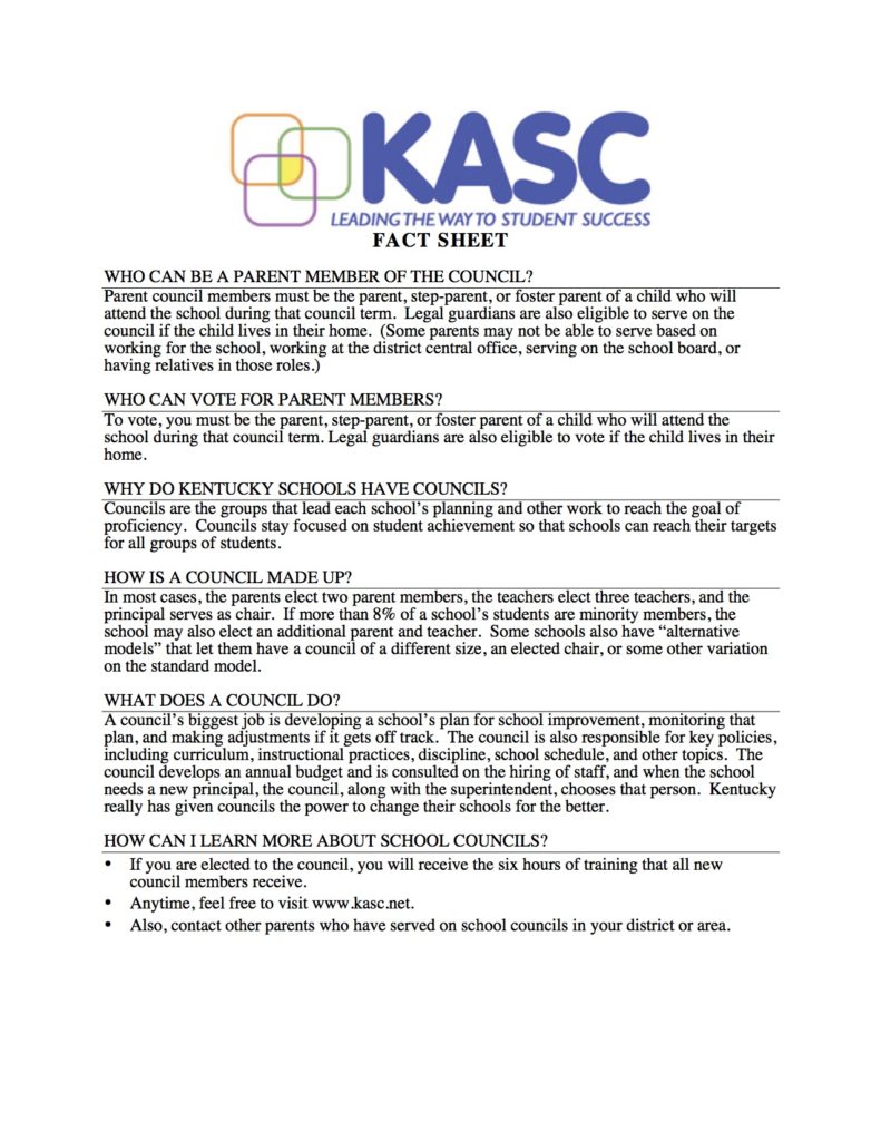 In Kentucky, each school has a council composed of the principal, elected teachers, and elected parents who make many of the most important decisions about how their school will work. The council is a wonderful chance to learn about your school, work closely with teachers, and help make our school even more successful than it is now. The parent members of the council are elected by parents. This year we are electing a parent representative for a 2 year term, as well as a minority parent for a 1 year term. Each will receive training and will serve from July 1 to June for their terms. To help with questions you may have, I’m enclosing a fact sheet about parent members of Kentucky school councils.