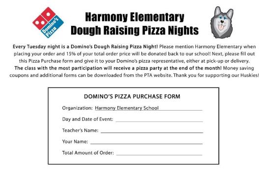 Each TUESDAY, mention Harmony Elementary when placing your order, and give this Pizza Purchase Form to the Domino’s Pizza Representative upon delivery or at pickup. Each month, if there is enough participation, we will announce the class with the highest and they will receive a FREE PIZZA PARTY!